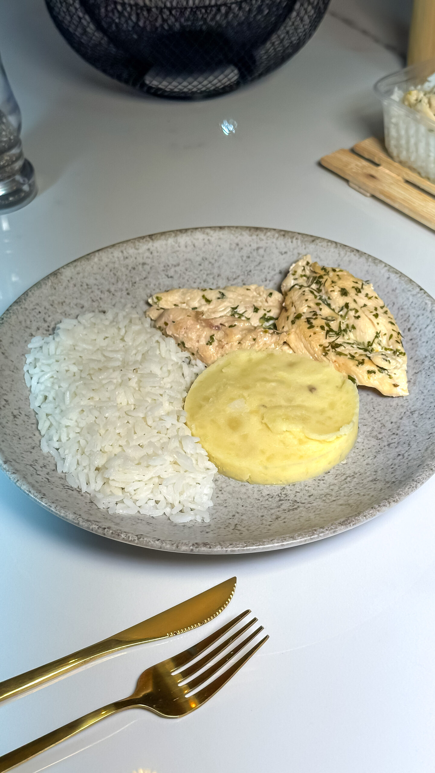 Este prato reúne o arroz branco soltinho, um purê de batata cremoso e um filé de frango grelhado macio e suculento. Cada porção de 300g é preparada com ingredientes frescos e tempero caseiro, resultando em uma refeição prática, saborosa e reconfortante. Ideal para quem quer uma combinação clássica, leve e nutritiva, perfeita para qualquer hora do dia.