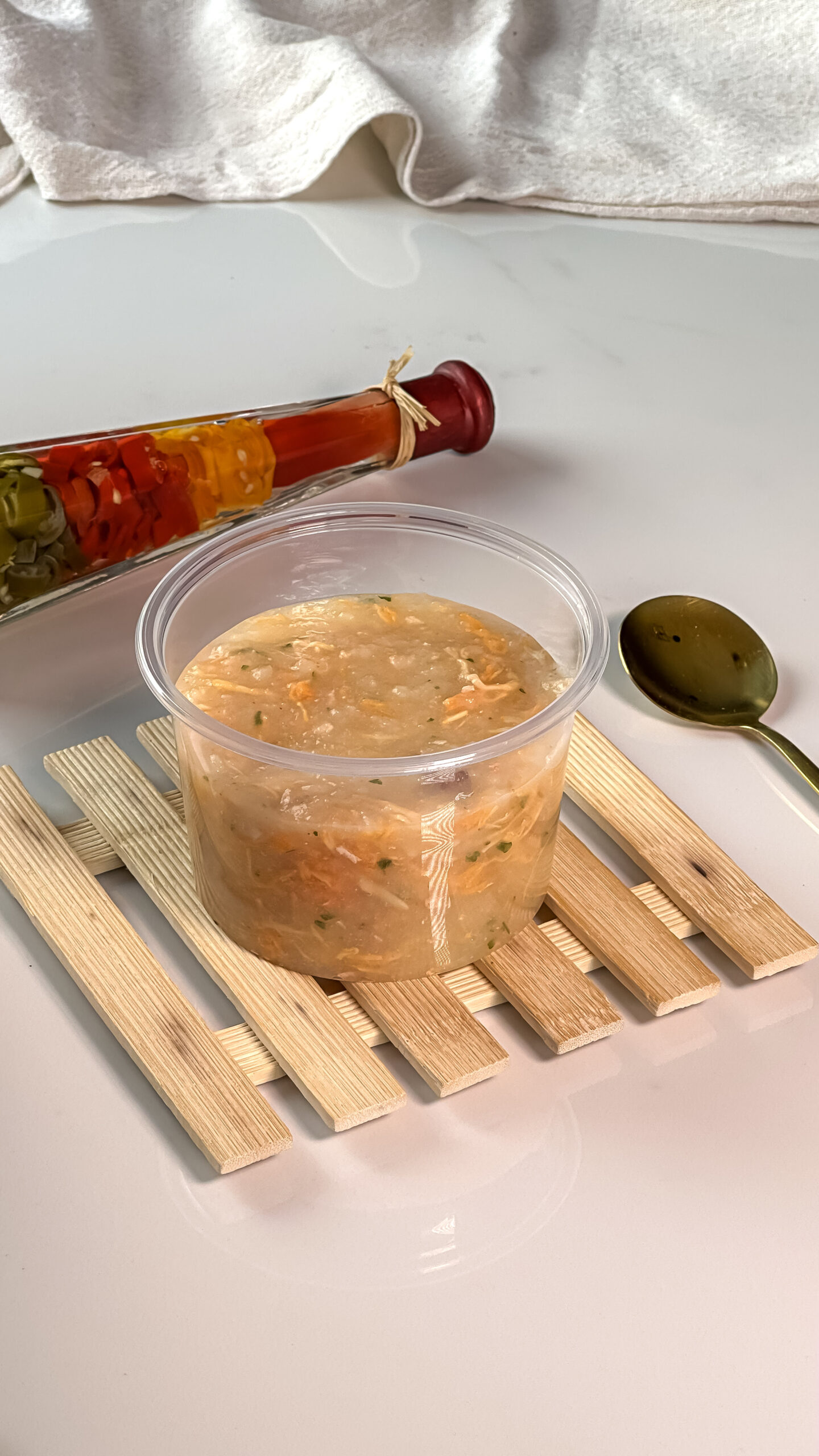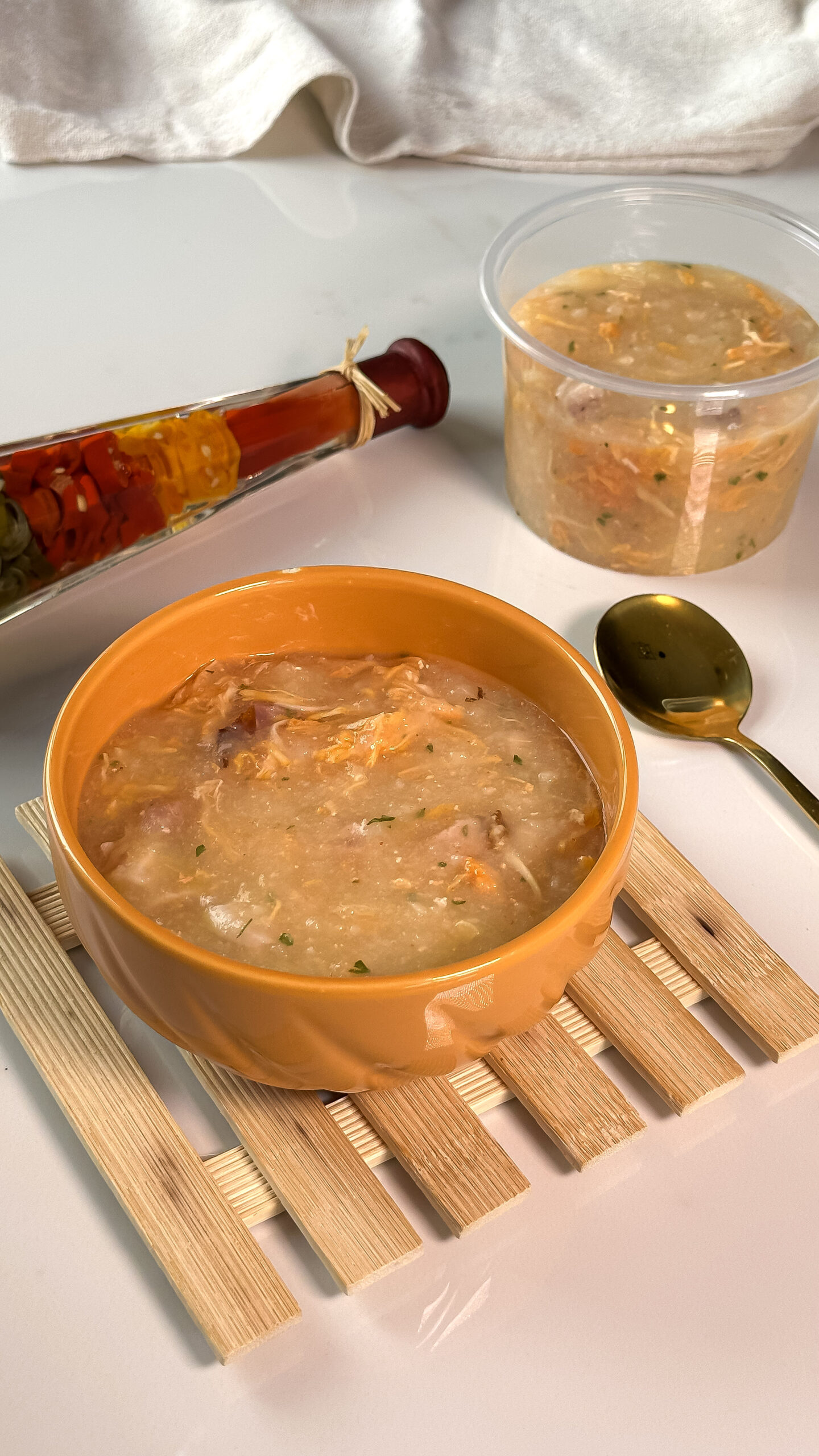 Este saboroso caldo de aipim combina a cremosidade do aipim bem cozido com pedaços macios de frango e o toque defumado do bacon. Cada porção de 400g é preparada com ingredientes frescos, garantindo uma refeição encorpada, reconfortante e cheia de sabor. O frango desfiado se mistura ao aipim, enquanto o bacon traz uma camada extra de aroma e sabor marcante, tornando este caldo uma opção perfeita para aquecer o dia e satisfazer o paladar.