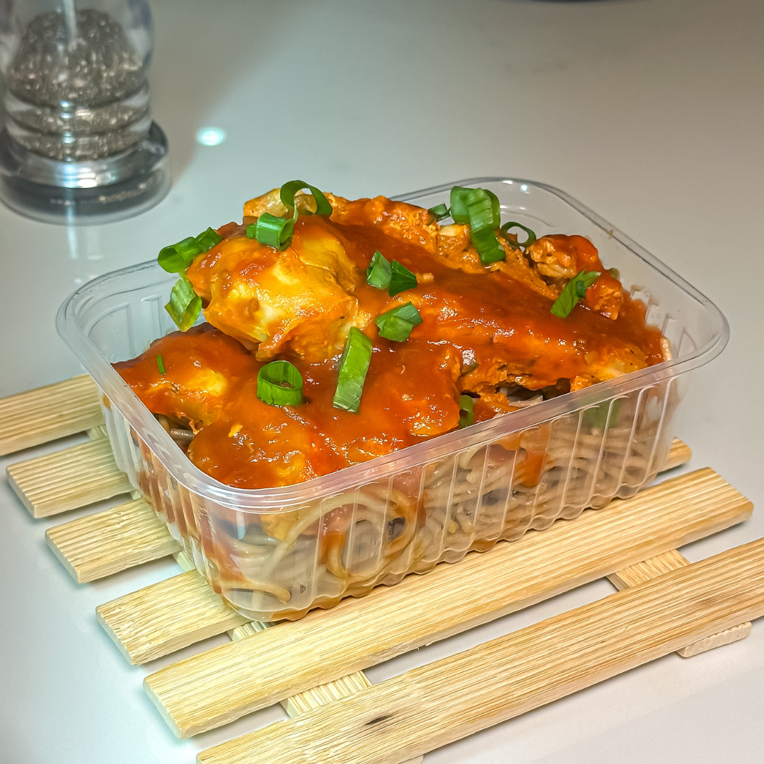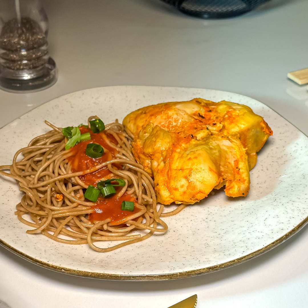 Delicioso e saudável Espaguete Integral com Filé de Sobrecoxa, com porção de 400g. Este prato, pertencente ao nosso Menu Unitário, é perfeito para quem busca uma refeição equilibrada e saborosa. Com 371kcal, o espaguete é cuidadosamente preparado para manter o sabor autêntico e a textura desejada, enquanto o filé de sobrecoxa é suculento, macio e bem temperado, garantindo uma experiência gastronômica surpreendente. Um prato irresistível que combina saúde e prazer à mesa.