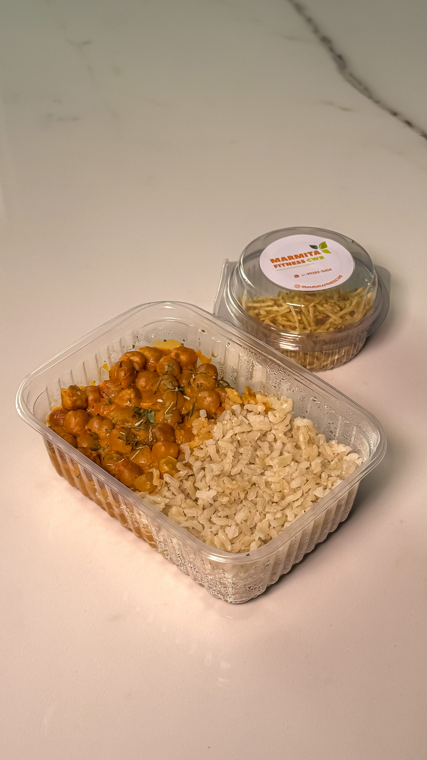 Strogonoff de grão-de-bico com arroz integral e batata palha (300g)